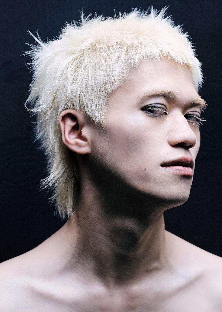 「今回、2作品を対で見せたいと思い、まずは男性モデルをクールでジェンダーレスなスタイルに仕上げました。最初、きれいなまとまりのあるヘアスタイルに仕上げたのですが、そうすると写真としてはおもしろくならなかったので、毛先を散らして、きれいすぎず、まとまりすぎず、それでいてフォルムのわかる絶妙なバランスにつくり直しました。カットからすべて任せてくださるモデルさんだったので、いつもはコンテストに合わせた作品が多いのですが、地毛を使って、自分らしいヘアスタイルを思いっきり表現できました」