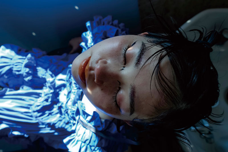 「この作品は、日常的なナチュラルさとどこかクセのある違和感を出そうと撮影に挑んだもの。ふとした瞬間、楽しかった思い出を振り返っている……そんなワンシーンを切り取ろうと思いました。ミラーボールを使って想像の世界のような光加減を演出しながら撮影を。ヘアはカチモリをベースに、自分でヘアアレンジしたような無造作な雰囲気をイメージしてつくっています。顔まわりのうぶ毛を効果的に見せ、かわいいポイントをつくったのもこだわりです。青みの強い色味、暗闇、かわいいもの、私の“好き”を詰め込んだ作品です!」