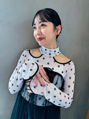「クリエイティブを始めたのは2年前。ドリプラでエリア入賞したのを期に、作品撮りを行うようになりました。でも、私が目指すのはリアルサロンワークで通用する“かわいさ”。今回、つくり込みすぎず、モデルさんの魅力が素直に伝わる作品づくりを。タイトルの『柔らかくて、鋭い』、相反する要素をどう共存させるか悩みました。黒髪は重く見えがちですが、敢えて黒髪でカッコよさを表現しつつ、ポイントで髪に動きをつけて抜け感を出し、柔らかさを表現しています」