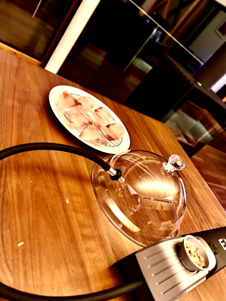 ちょっと自然の中でみんなで食べたり飲んだりするときはもちろん、自宅でもちょっとしたときに、魚とか肉とか、ナッツとかもね。なんでも手軽にスモークして楽しんでいます。もともと何でもスモーキーな味わいっていうのは好きな方で、自宅でフライパンにホイルとチップをセットしてスモークしたりとかやっていたんです。このマシンがイイのは片付けのストレスがほとんどないことですね。網とドームが主なんだけど、なんだろう汚れにくいような感じがあります。
