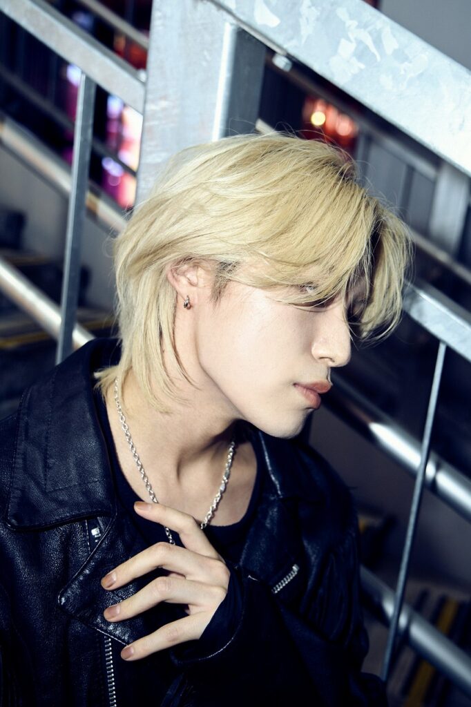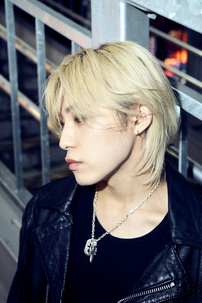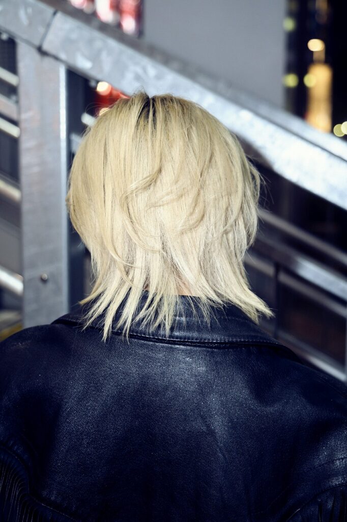CUT/全体前上がりのグラデーションでローウェイトに仕上げる。モヒカンラインのみレイヤーを入れて動きを出す。フロントのうぶ毛を短めにカットしておさまりと軽さを出す。COLOR/ブリーチ2回。抜きっぱなし。STYLING/スタイリング剤はクリームのみ。極細の束をバック方向に流して作る。バックのスタイリングはアシンメトリーに仕上げ、えりあしはみつえりだけ前に流してあとは下にまっすぐ落として完成。