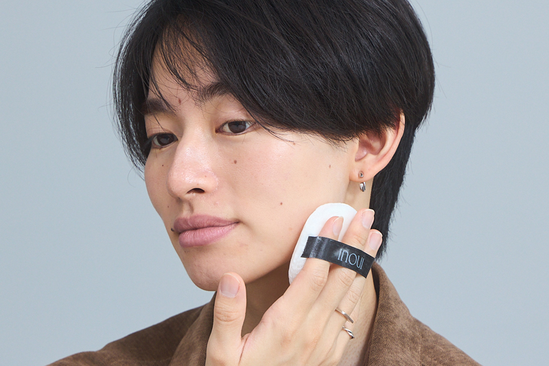 ハイライターはツヤ感も魅力的だけど、光を反射することで顔に立体感を作るアイテム。その立体感をよりナチュラルに引き立ててくれるのがフェイスパウダー。Gokenさんのおすすめの使い方は、フェイスラインにパウダーをのせること。フェイスラインがマットになることで、ほおのツヤ感とのメリハリがついてより立体的な顔立ちに見せることができる。つまり、シェーディングを入れなくても質感の差だけで立体感が増すということ。立体感が出ると、小顔効果も期待できるのがうれしい。