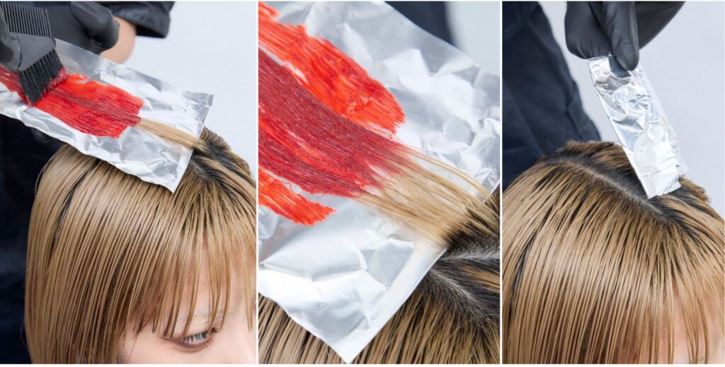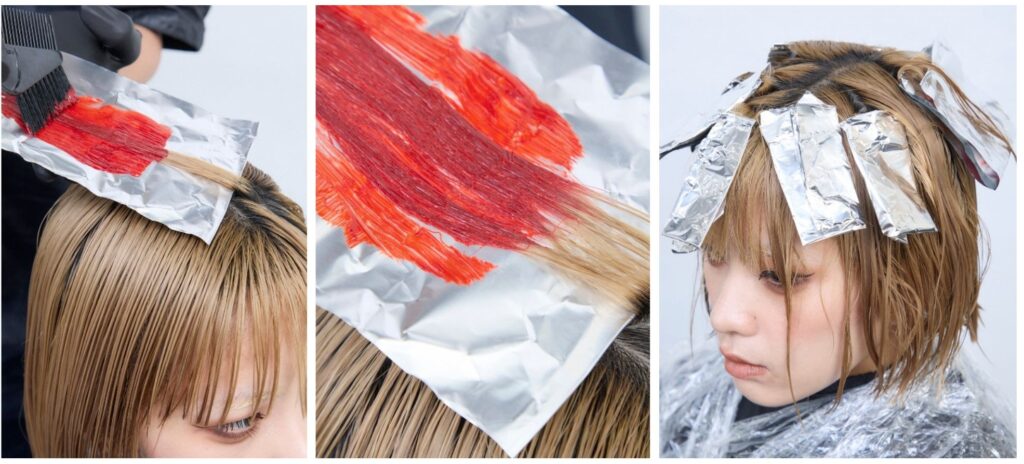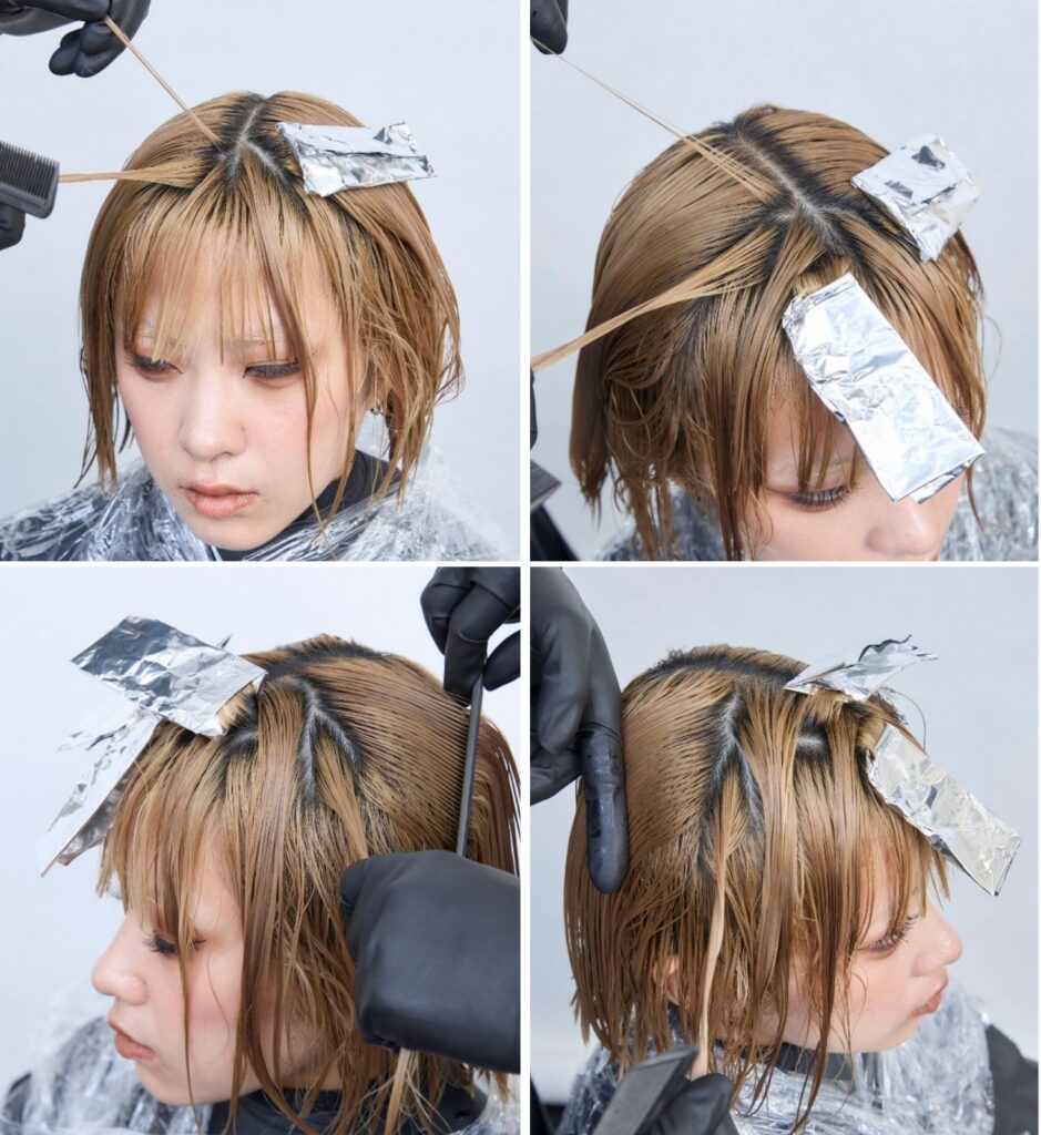 ④ホイルにのせて、パネルの裏側からカラー剤を塗布することで、髪を下ろしたとき、塗り始めの部分にグラデーションでカラー剤がのり、より自然なぼかしが可能。欲しいデザイン次第ですが、今回は根元2~3㎝から塗り始め、一発塗りとなるため、塗りムラが出ないように毛先までしっかり塗布します。