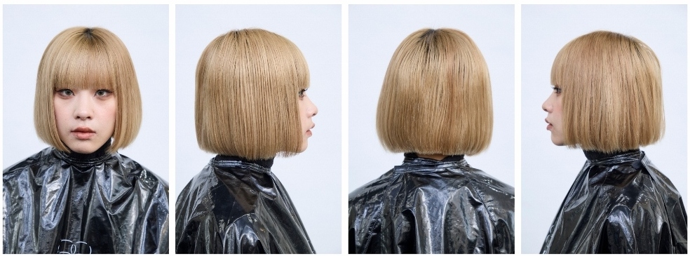 20 日前にカラーしたばかり。ベースを18 レベルに整えたブロンドベージュ。あごラインのボブ、レイヤーは入っていない。