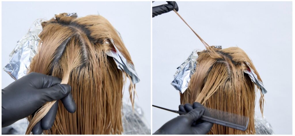 (左)細めの毛束を取り出し、パネルの裏側からカラー剤を塗布することで塗り始めにグラデーションがつき、自然なぼかしになります。