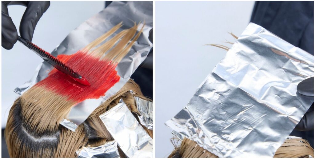 ⑮カラー剤が毛先につかないように、毛先を外してホイルをたたんで。