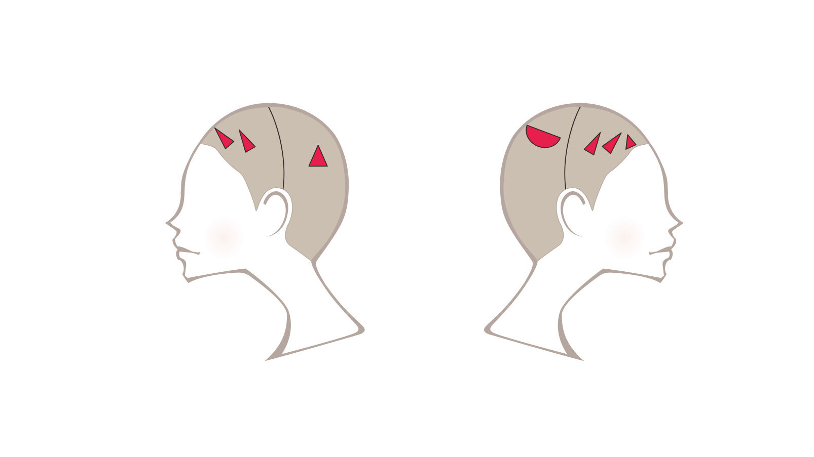 (右)顔まわり4 カ所(片サイド2 カ所ずつ)、前髪1 カ所、バック2カ所にスラッシュカラーを入れていきます。