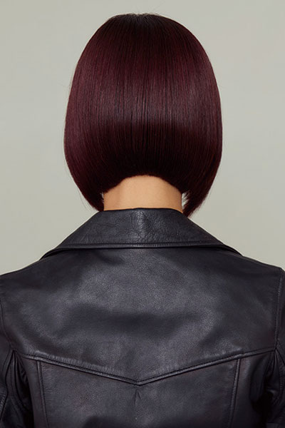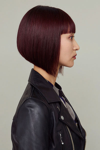 CUT/前下がりボブベース。ベースカットはグラデーションから切り始め、奥行きとウェイトをつくってからアウトラインをカット。サイドは厚みが出すぎないようグラデーションのままカット。量感調整は、毛先を持ち上げた状態でグラデーション状、表面はレイヤー状にチョップカット。COLOR/ベースは7レベルの赤とピンクをミックス。黒のローライトを前髪と両サイドのこめかみに、アシンメトリーにオン。STYLING/ストレートアイロンで毛先を内巻きに。オイルで仕上げる。