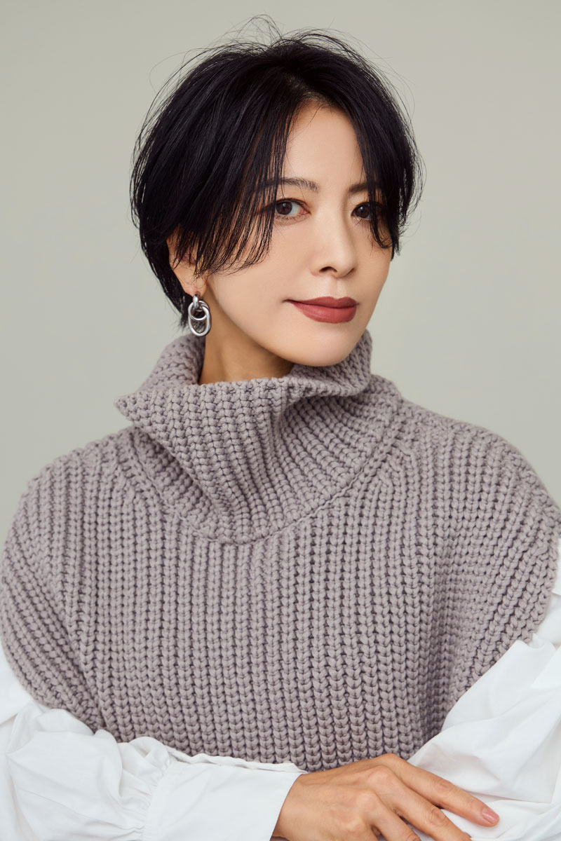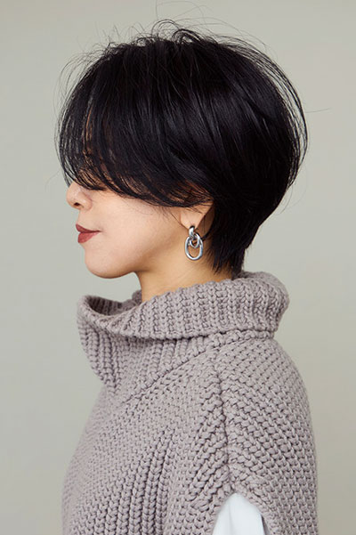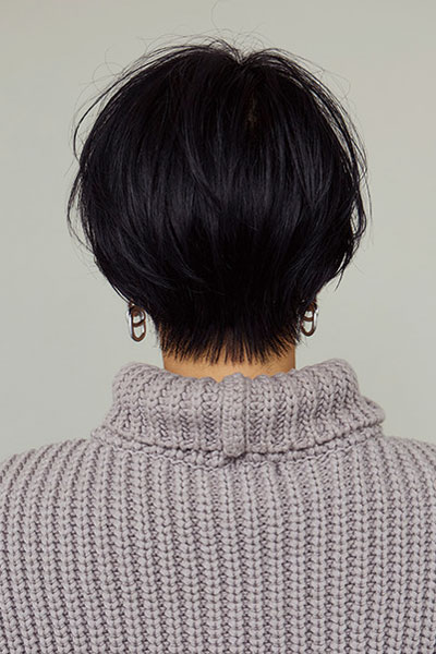 黒髪ショートに出やすい“暗さ”や“重さ”は、ツヤ感とレイヤーで解消させました。大人顔に合わせて前半分の重心を下げ、バランスよく調整。バックは締めてクールなメリハリをつけています。サイドを耳にかけなければフェミニンな印象にもチェンジ可能!