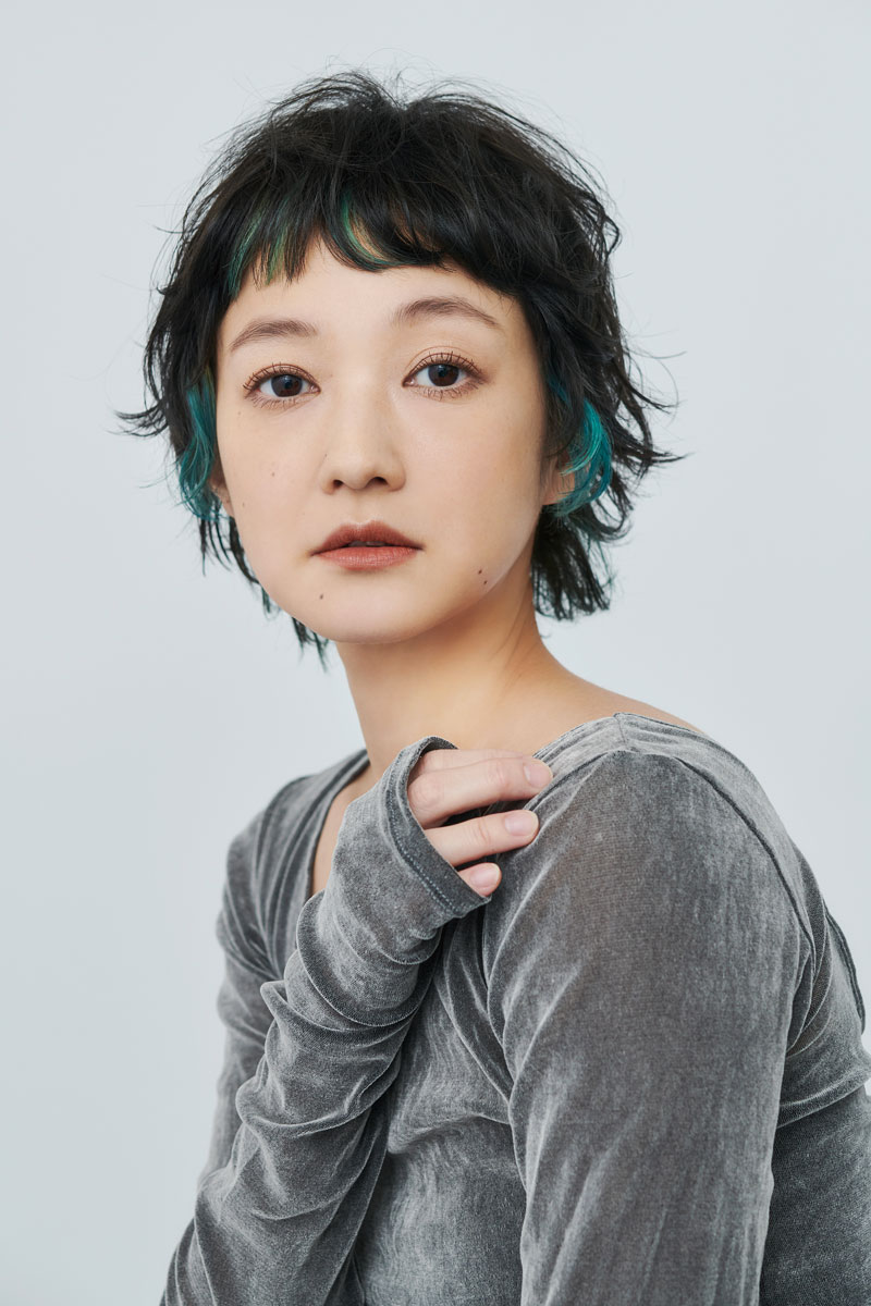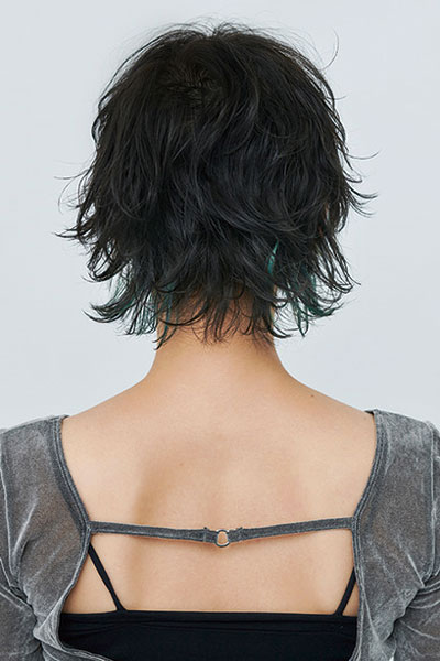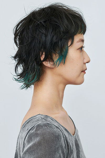 CUT/ショートウルフ。バングは眉上ラインでカットし顔まわりにつなげる。トップはボリュームが出るようレイヤーを入れてすべてのアウトラインにつなげる。PERM/フロントは20㎜でパーパス巻き。トップは17㎜で根元まで巻き込む。えり足は15㎜で逆巻き。それ以外は17・15㎜でリバース・フォワード交互のスパイラル巻きに。COLOR/フロント、もみあげ、えり足はブリーチ後クリアブルーをオン。ベースは6レベルのブルーアッシュ。STYLING/ハーフウェット時にオイルフォームをなじませドライ。