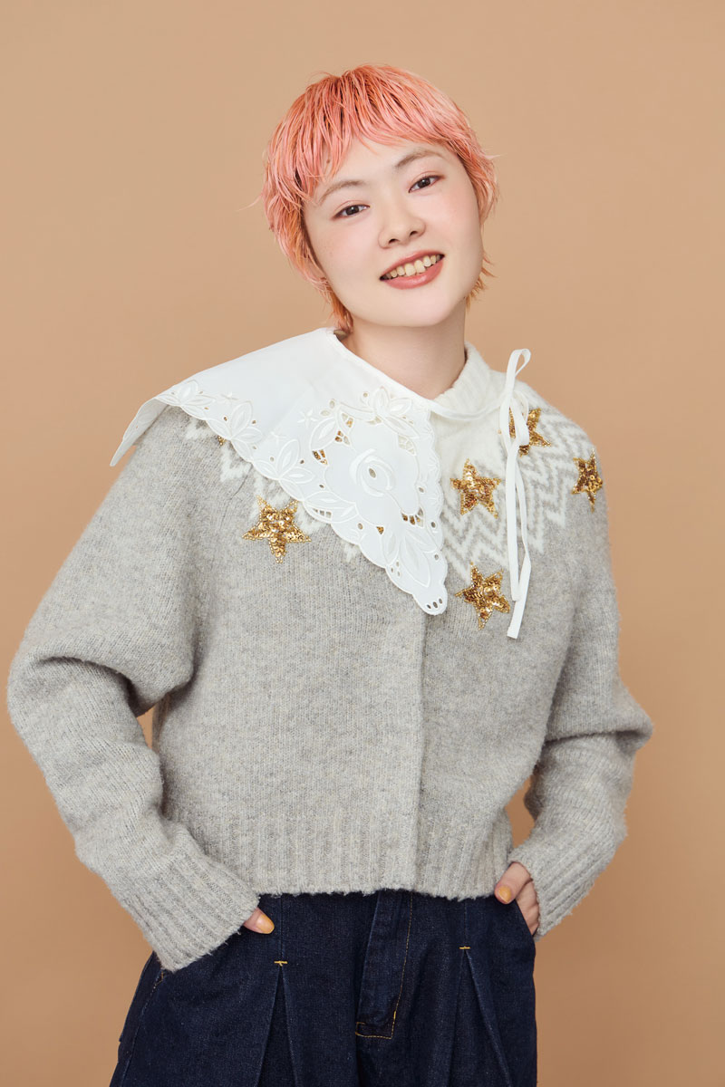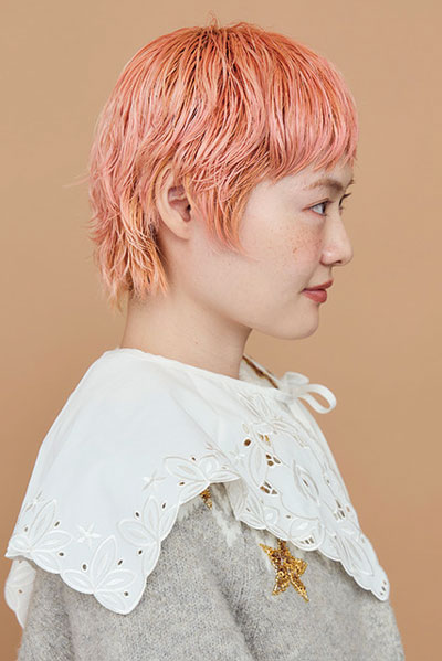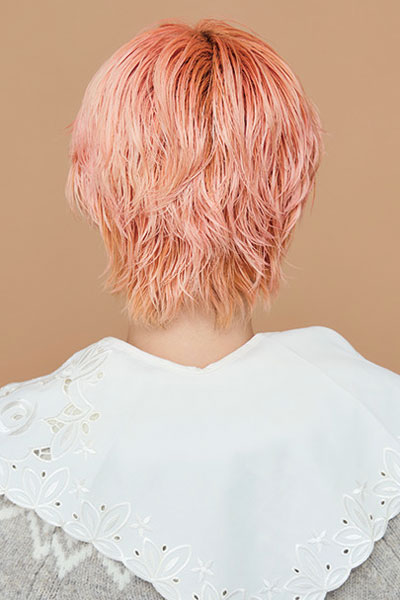 CUT/ショートレイヤーベース。前髪はマッシュぎみで眉上に設定し、厚さを残してカット。COLOR/根元は17.5レベル、毛先は18〜19レベルで、薄めのコーラルピンクをオン。STYLING/ウェット状態でフォームを髪全体にもみ込む。その後、柔らかめのワックスで整える。