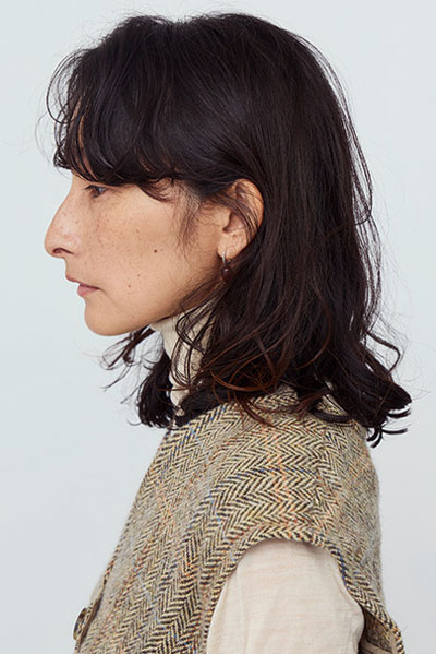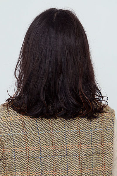 どうしてもコンサバティブになりがちなミディアムやロングは、あえてレイヤーを入れずに角を残した重めのブラントカットにし、毛先から中間にかけて徐々にゆるくなるパーマをかけました。重さを残しながらも軽さを感じる、個性的なスタイルが完成です。
