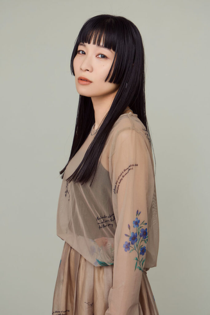 CUT/胸下のワンレングスベース。サイドの耳より前は、ピアスが見える耳下ラインで水平に設定。前髪は眉上5㎜で水平ぎみにカット。ベースはセニングを入れず重みと厚さ残し、サイドと前髪は束感が出るよう間引くようにセニング。STYLING/ストレートアイロンでナチュラルなストレートにしたあと、オイルを薄く付けて束感を出す。