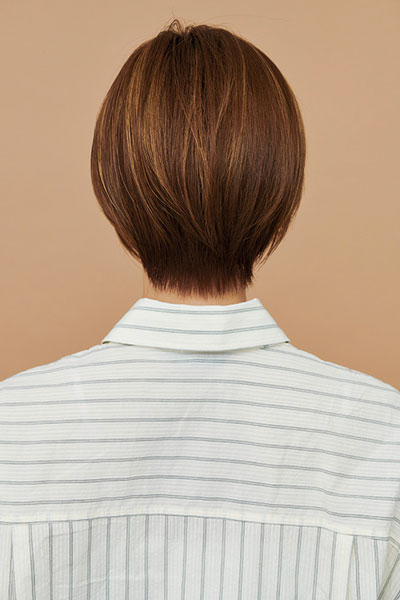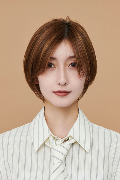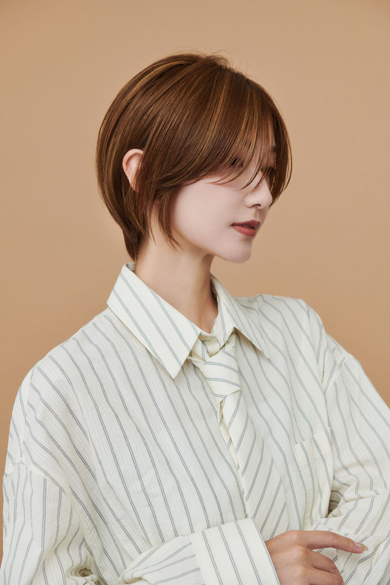 CUT/前下がりのグラデーションショート。ハチ上は角を取る程度のレイヤーをオン。バングは奥行き3㎝×黒目幅で取り鼻下でカット。顔まわりはバングのエンドからもみあげまでをレイヤーでつなげる。量感調整は表面は外して、ミドルは根元から、トップは中間からレイヤーセニングを施す。COLOR/9レベルのナチュラルブラウンベースに、16レベルのベージュのハイライトがところどころ入った状態。STYLING/バームにオイルを混ぜたものをえり足からなじませ、トップは毛先中心に塗布する。