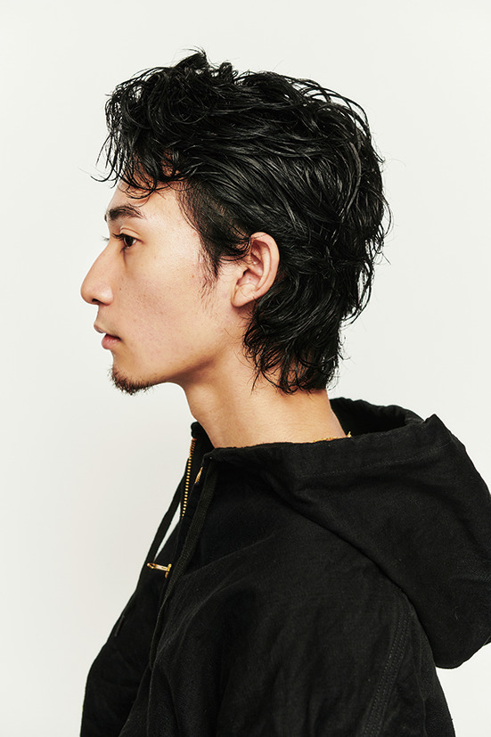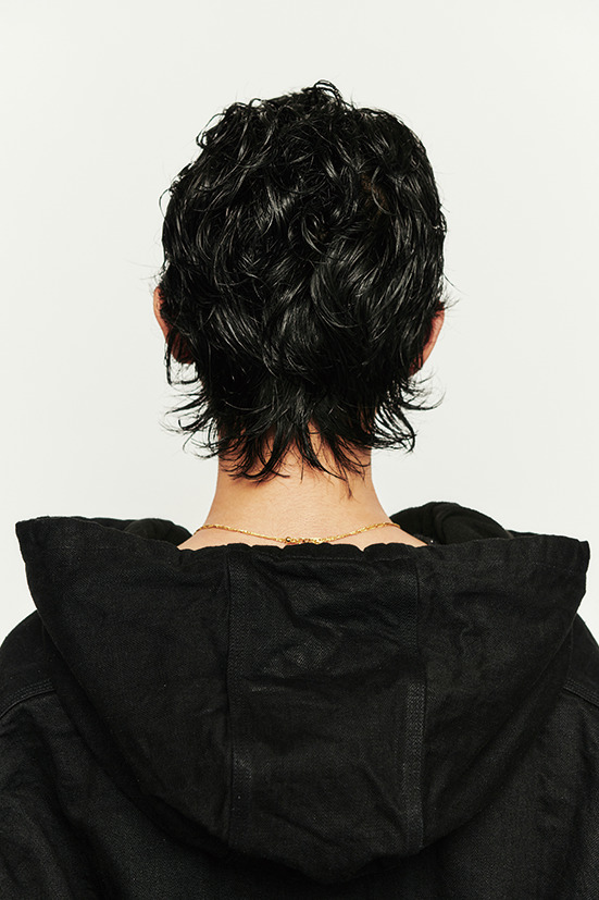 ブラックカルチャーから着想したショートウルフスタイル。カルチャー感を表現するうえで、束感と重さにこだわった。リッジの効いたカール感はパーマではなくクセ毛を生かしたもの。ジェルでオールバック風にスタリングすることで、男くさいルードさが渋くにじむ仕様に。model: Imaoka Takashi