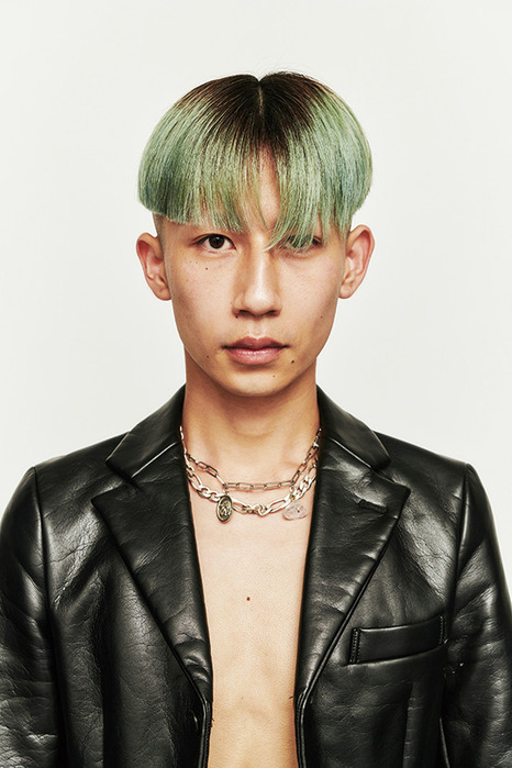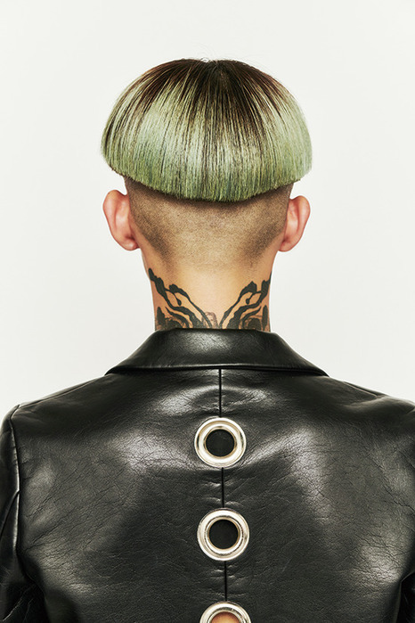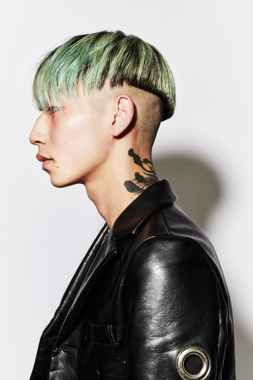 90年代、ラフ・シモンズのモデルのテクノカットを再解釈したスタイル。右サイドはバツッと切り落とし、左サイドはブラントからザクザク質感に変化することで前下がりのラインを強調した。大胆な刈上げ、アシメなライン、そしてミントグリーンで遊び心と洒落感をプラス。model: Ebihara Masashi