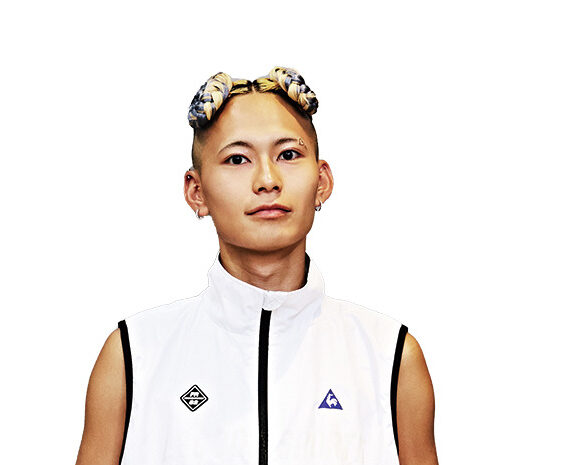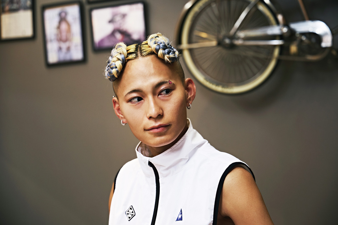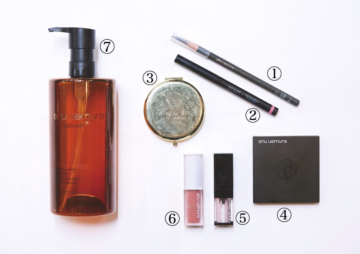 「ヘアに合わせて、ファッションもメイクも白を意識しました。目元に入れた白のグリッターがポイントです。ファンデーションなどのベースメイクはしていなくて、ニキビができたらコンシーラーでポンポンとカバーするぐらい。できるだけメイク感は出したくないので、ポイントメイクをプラスして遊ぶ程度なのですが、遊びの部分は遊びだってわかるようにするのがポイントです。彼女が『シュウ ウエムラ』で働いているので、道具の使い方や、肌質に合ったアイテムを選んでもらえるので助かっています」