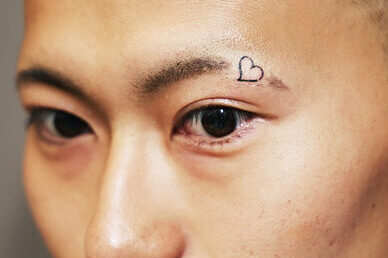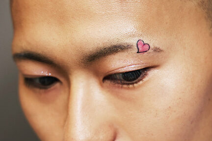 左:上まぶたの中央に、白のグリッターを指でのせて遊びをプラス。さらに、眉に入れたハート型のタトゥーの内側をピンクで塗ってアクセントに。