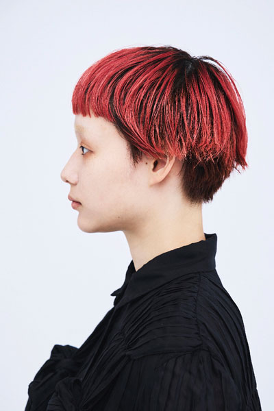 CUT/グラデーションベースの前上がりのショートボブ。トップと顔まわりにレイヤーを入れる。前髪は厚めにつくり、モード感を際立たせる。STYLING/水:オイル=1:2で混ぜ、全体にしっかりもみ込む。水を混ぜるとベタつかず、髪へのなじみがよいだけでなく、光沢を出しつつ抜け感も出せる。