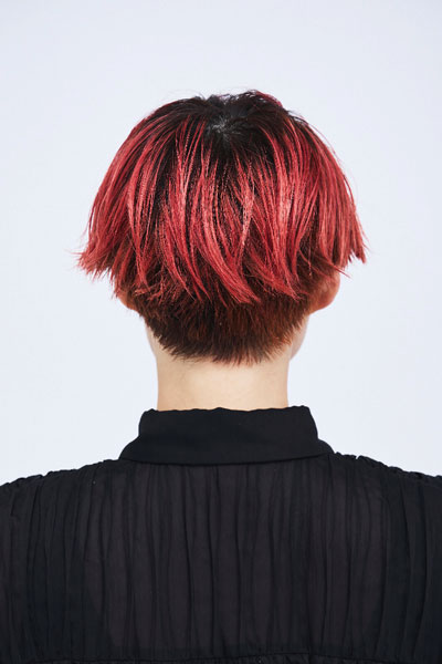beforeは全頭黒染め。ライトナーで13~14レベルまでトーンアップ。ネープと表面をランダムに毛束を取って細めのブリーチを施し、9レベルのガーネットをワンメイク(OX4.5%)。