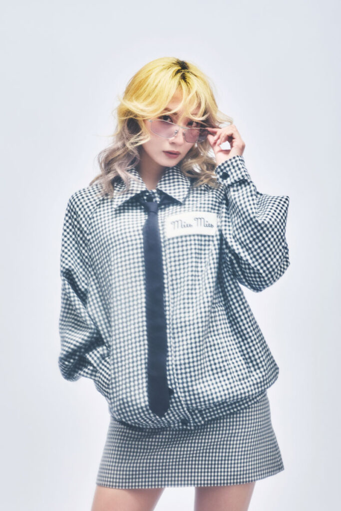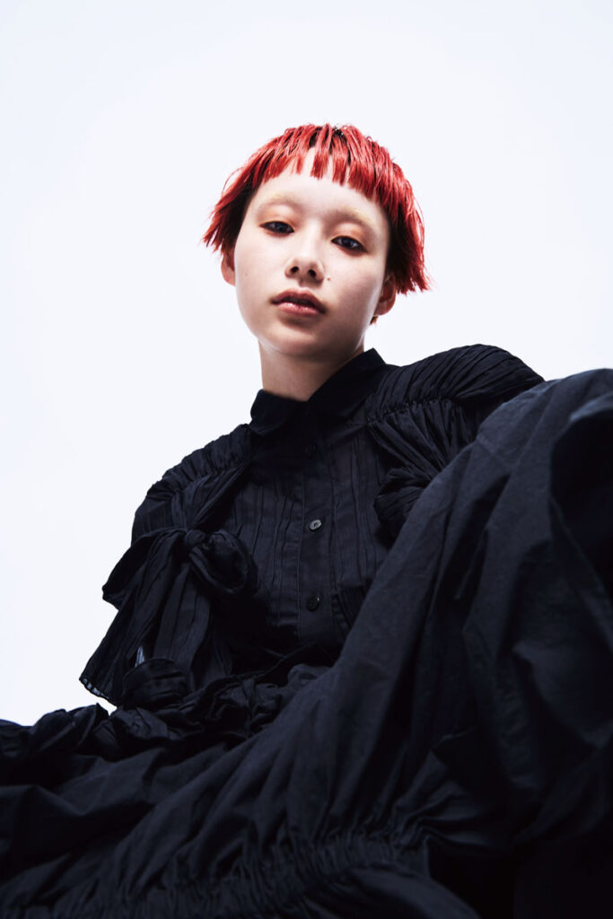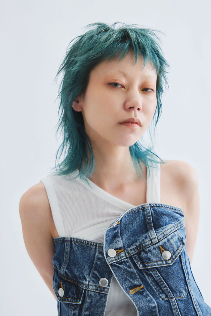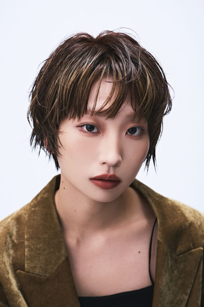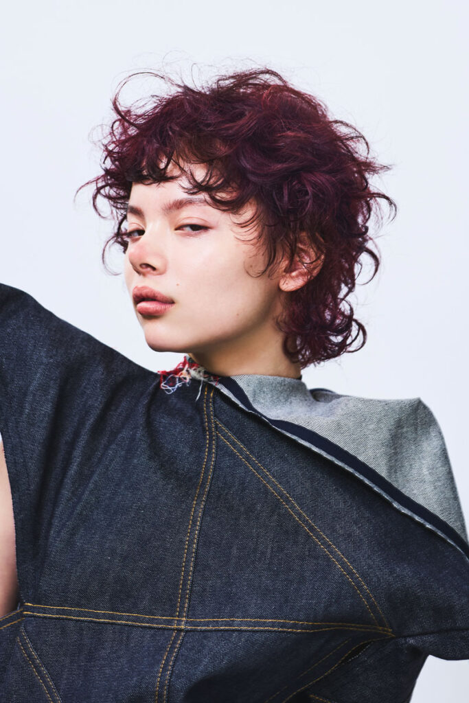 CUT/ベースはラフなウルフ。抜け感を出して整いすぎない質感にし、ナチュラル感を演出。STYLING/アイロンやブローなどはあえてせず、クセや自然なふくらみを生かしてキメすぎない”攻めナチュラル”に。全体にオイルを塗布し、数分経過して髪が油分を吸い込み始めたときに毛先を整え、ぬるっとした質感をつくる。
