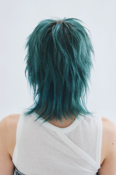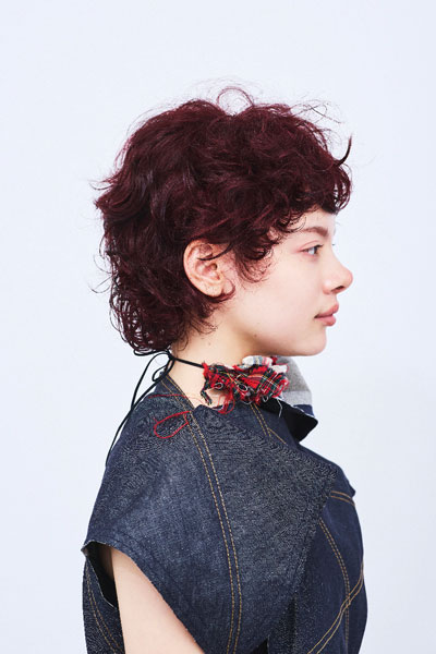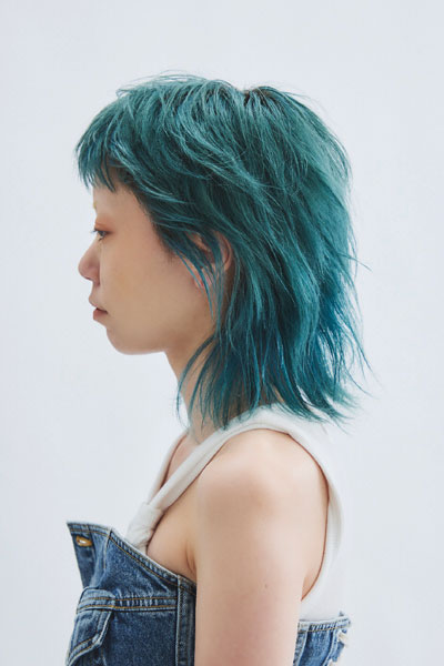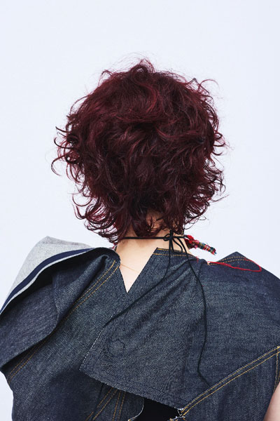 CUT/ワイドバングのマッシュウルフ。全体にスライドカットを入れて軽さを出す。STYLING/全体にクセある&パーマの残りを生かし、19㎜のロッドをオールパーパスで平巻き。耳後ろのみ逆巻きにし、顔まわりと耳前はピンパーマを巻く。ロッドオフ後、カールをクッションブラシでとかしてほぐし、水を付けてセミウェットに。ハチ下~耳後ろにオイルを付けてなじませる。