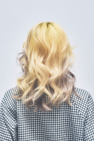 ベーシックなミディアムレイヤーに、奥行きのあるカラーを入れたのがポイント。イヤー・トゥ・イヤーより前は耳上から1㎝ずつ横スライスでパネルを取り、下からベージュとイエローを交互に塗布しています。前髪もツートンカラーにしておしゃれな雰囲気に仕上げました。