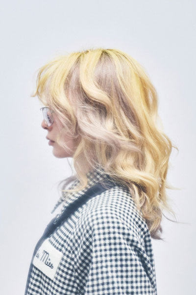 CUT/前髪をノーズラインでカットしたミディアムレイヤー。STYLING/中間~毛先にかけ、32㎜のアイロンで全体的にリバース、フォワードのミックス巻きに。ほおにめがけてフォワードに巻いて小顔効果を狙い、その後ろのセクションはリバースに巻く。仕上げにソフトワックスを塗布してドライでマットな質感に。