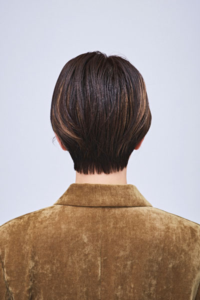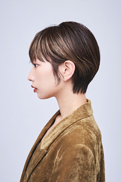 CUT/もみあげ~サイド~バックにかけて平行にカットし、毛先にブツ切り感を残しつつレイヤーを入れて動かしやすくする。バックは刈上げにし、ベリーショートの雰囲気とボブっぽさを同時に楽しめる「ベリーショートボブ」に。前髪はおでこの丸みに沿ってストレートにカット。STYLING/根元~毛先までまんべんなくオイルをつけ、束感を出す。