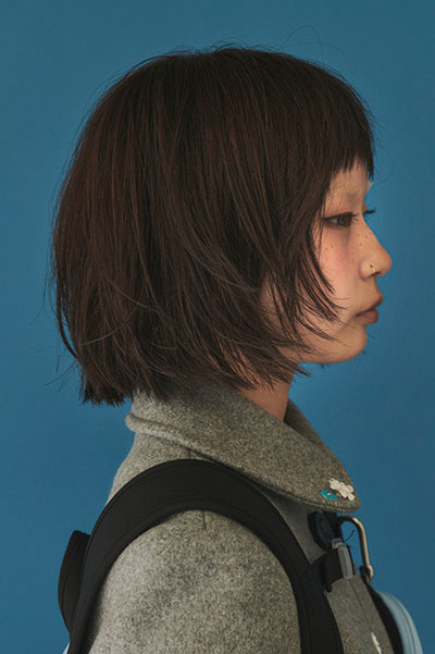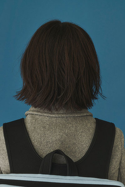 首詰まりのアウターには、軽やかな質感のレイヤーボブを合わせることで重くなりすぎない印象に。レイヤーボブは小顔効果があるので人気ですが、軽い質感のレイヤーが入ることで、マフラーなどの小物もバランスよく楽しめます。