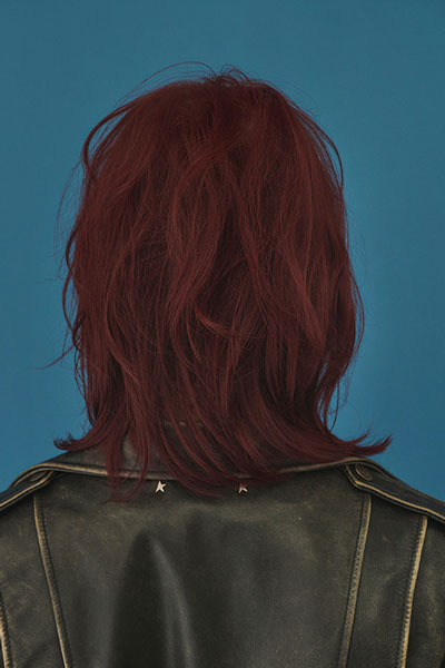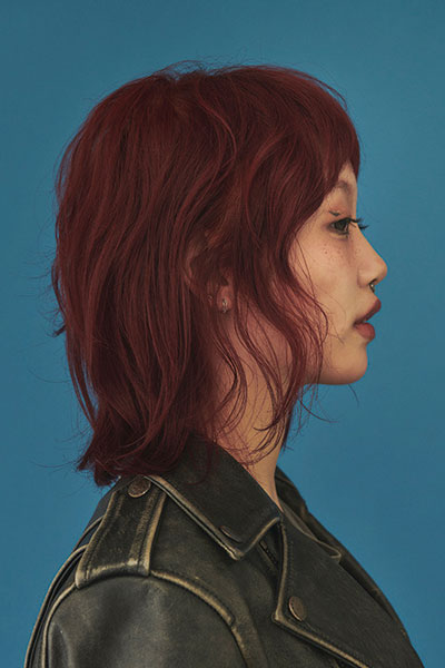 CUT/レイヤーボブベース。レイヤーで前髪も切り、後ろとトップにもレイヤーを入れる。COLOR/ライトナーで12レベルに。12レベルのブラウンを入れ、2回目に塩基性のバンパイヤレッドを塗る。STYLING/オイルを付けて毛流れを整え、ハードワックスで動きをつける。