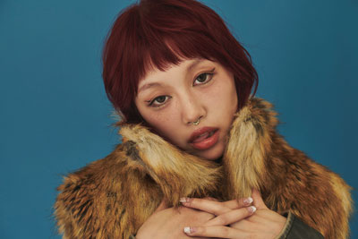 レザーアウターにファーベストを重ねた、アウターレイヤードが個性的。2000年代っぽい雰囲気に合わせて、前髪はオン眉に。