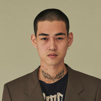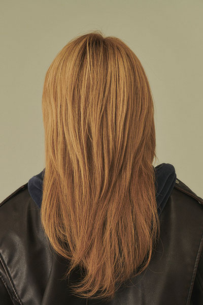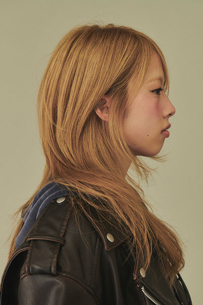 CUT/ミディアムレイヤーベース。顔まわりは落ちる位置でレイヤーカット。バックのアウトラインは強めの前上がりに。トップからのチョップカットで、シャギー感を出す。後ろは耳上からトップに対して削ぐようにレイヤーを入れ、前は厚みが出るようイヤー・トゥ・イヤーでオーバーダイレクションをかけ、レイヤーを。質感に合うよう、アンダーにはセニングを入れて毛先をぼかす。COLOR/10〜11レベルのベージュ。STYLING/ストレートアイロンでナチュラルにフォワード巻き。オイルにワックスを混ぜ、スタイリング。