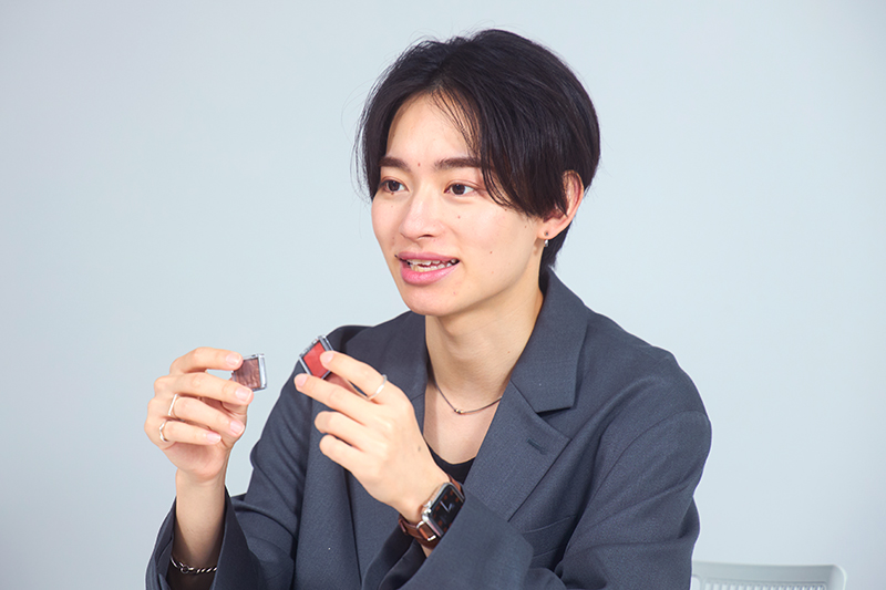 「しっかりメイクをするときは、今回ご紹介したような深めのブラウンや赤、陰影を際立たせるアイテムを使用します。ふだんは基本ナチュラルメイクですが、美容やアパレル関係の方が集まるときはしっかりとメイクをするとちょうどいい感じになります。あとは、結婚式や同窓会などのイベントや、気合いを入れたいとき、バーに行くときなんかもしっかりめのメイクをしています。ポイントとしては、アイラインをリキッドではなくペンシルで描いてブラシでぼかし、締め色のアイシャドウも一緒に溶け込むようにぼかすことで、目元のフレームがはっきりしてモードな雰囲気に見せることができます。それから、差し色としてリップに赤を使ったら、目元にも少し入れてリンクさせると不自然な差が出ずになじみやすくなるのでおすすめです」
