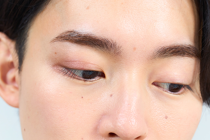 曲線より、直線的な形を意識したい。全体にいえることではあるが、特に眉とアイシャドウの入れ方を意識しよう。眉ならアーチを作らず、直線的に描くようにする。また、アイシャドウなら縦幅を出さず、丸みのない形をイメージしよう。ちなみに小技として、眉を描くときに手首を動かすと曲線的な眉になりやすく、ひじを動かすと直線的な眉になりやすいので覚えておこう。
