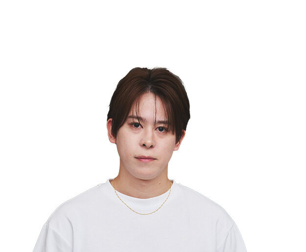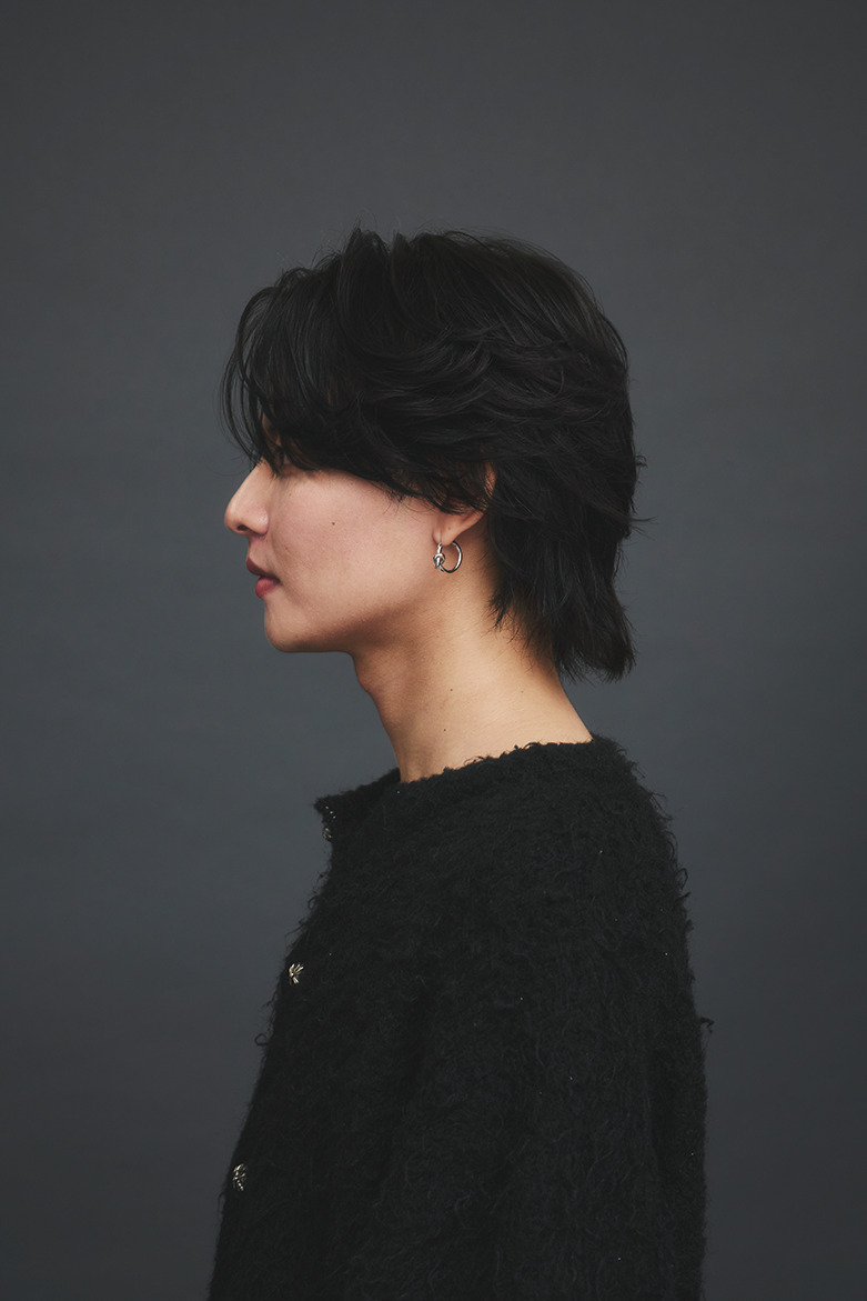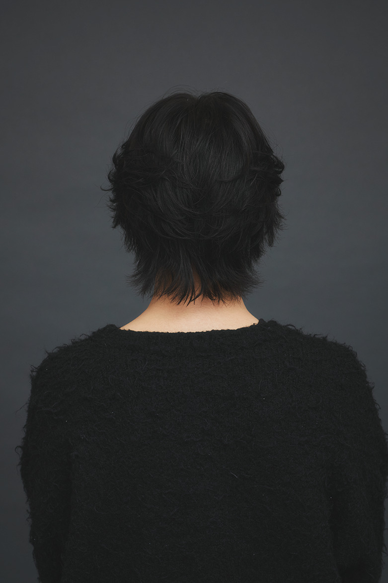CUT/ショートレイヤーベース。えり足はディスコネでカット。アンダー〜ミドルはハイレイヤーでくびれを作る。顔まわりのアウトラインはやや前上がりに。前髪は目にかかる長さにし、トップにハイレイヤーでつなぐ。