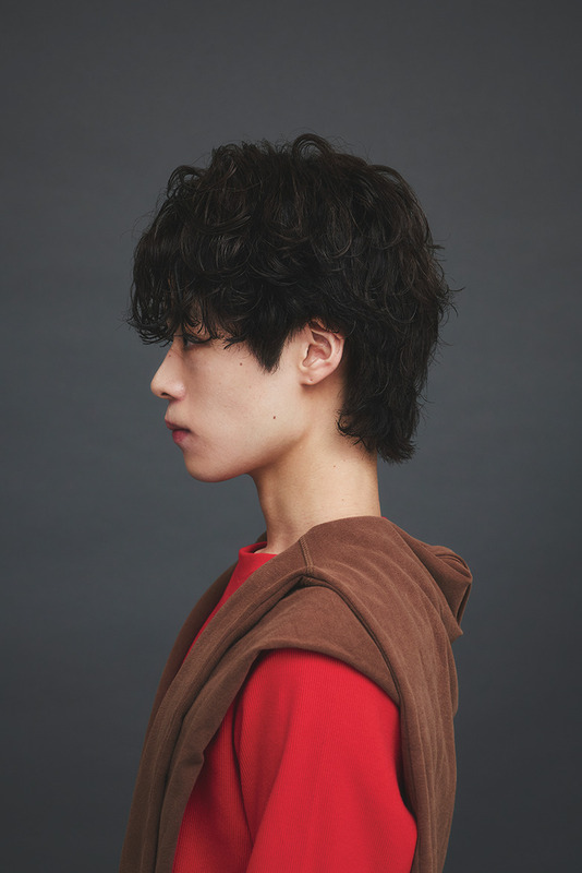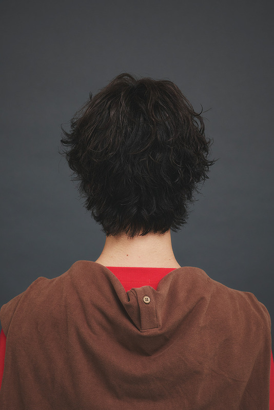 寝起きのようなラフな動きを意識したセンターパートマッシュ。トップには短めのレイヤーを入れてツイストスパイラル巻きにし、前髪のアウトラインは逆巻きでパーマをかけて複雑な動きを作った。平日は七三に分けてヨシ、休日はセンターパートで遊んでヨシとアレンジも自在。model: Sasaki Kodai