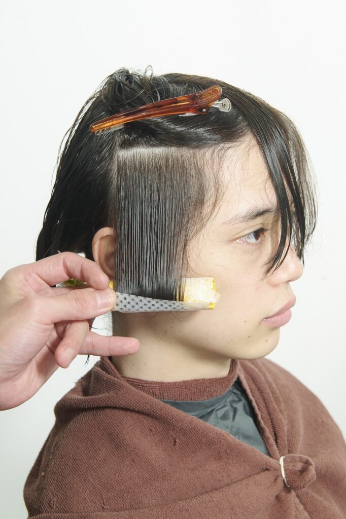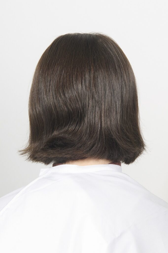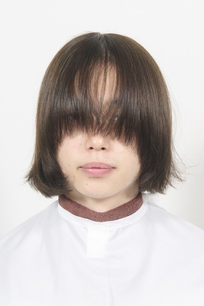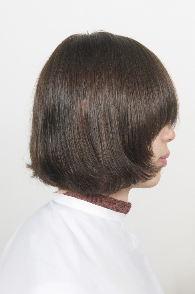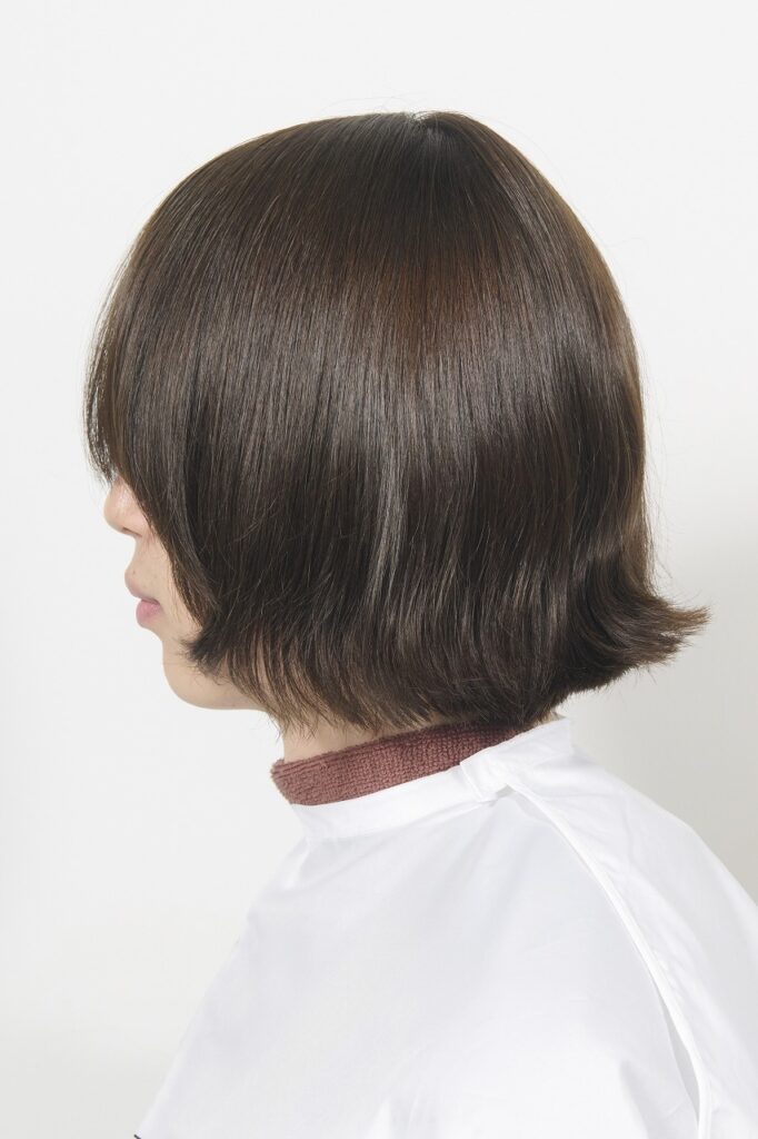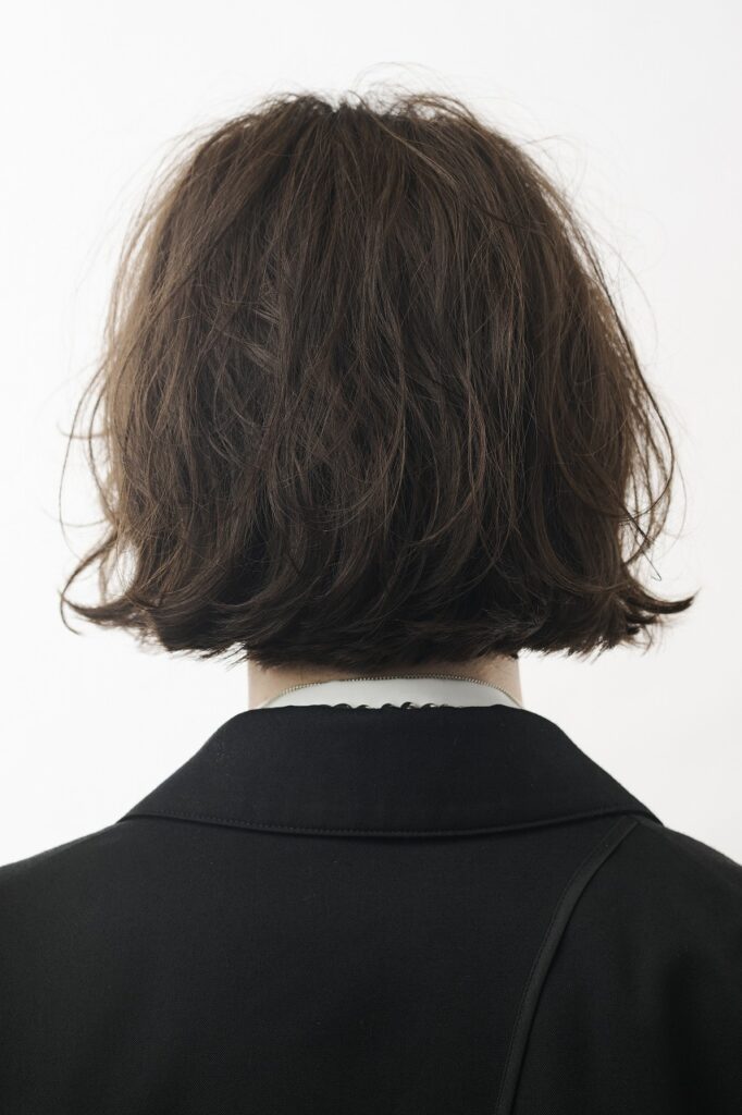 髪質は細く柔らかい。毛量は普通。耳後ろやネープに生えグセがあり、意外とパーマがかかりやすい髪質。カットベースはワイドバングのレイヤーボブ。