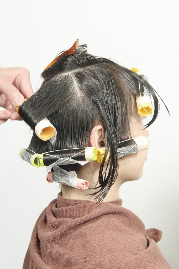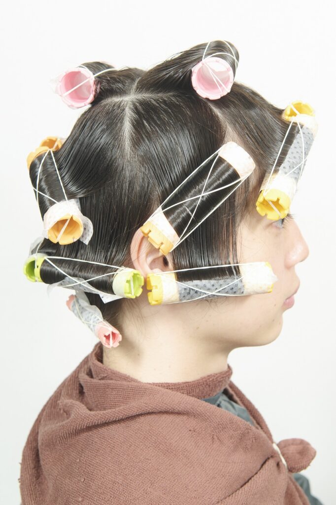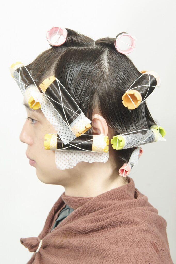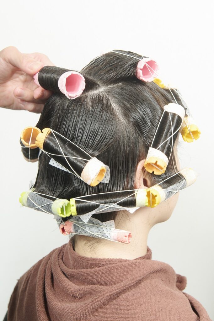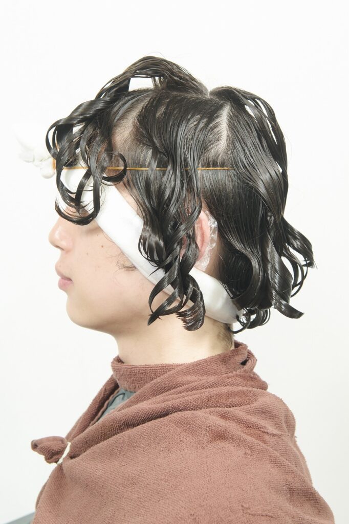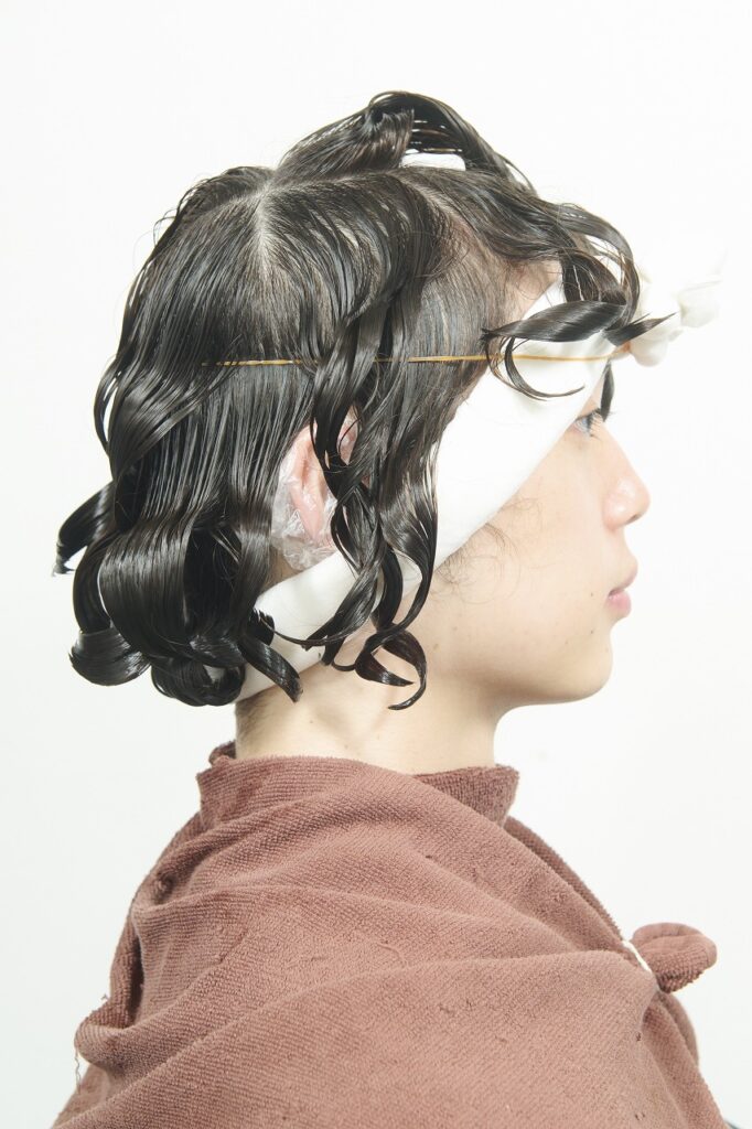 かかりにくいネープとミドルセクションのみ付け巻き。中間から毛先に薬剤を塗布し、平巻き。
