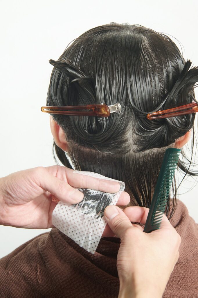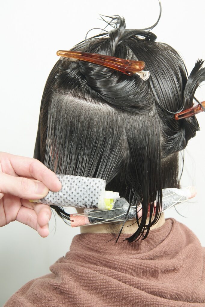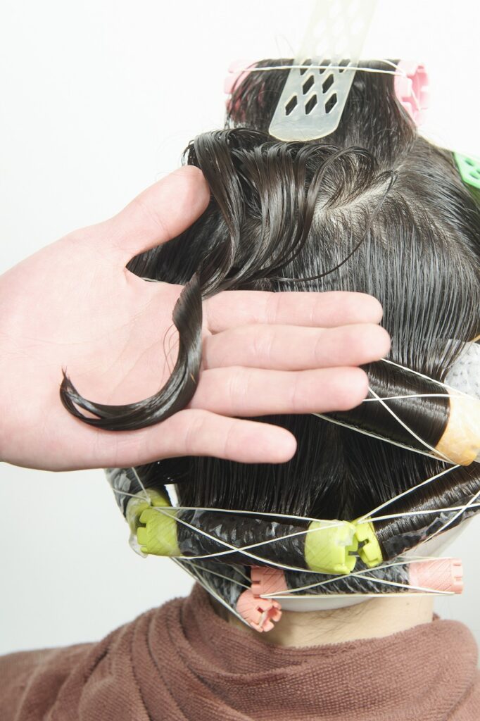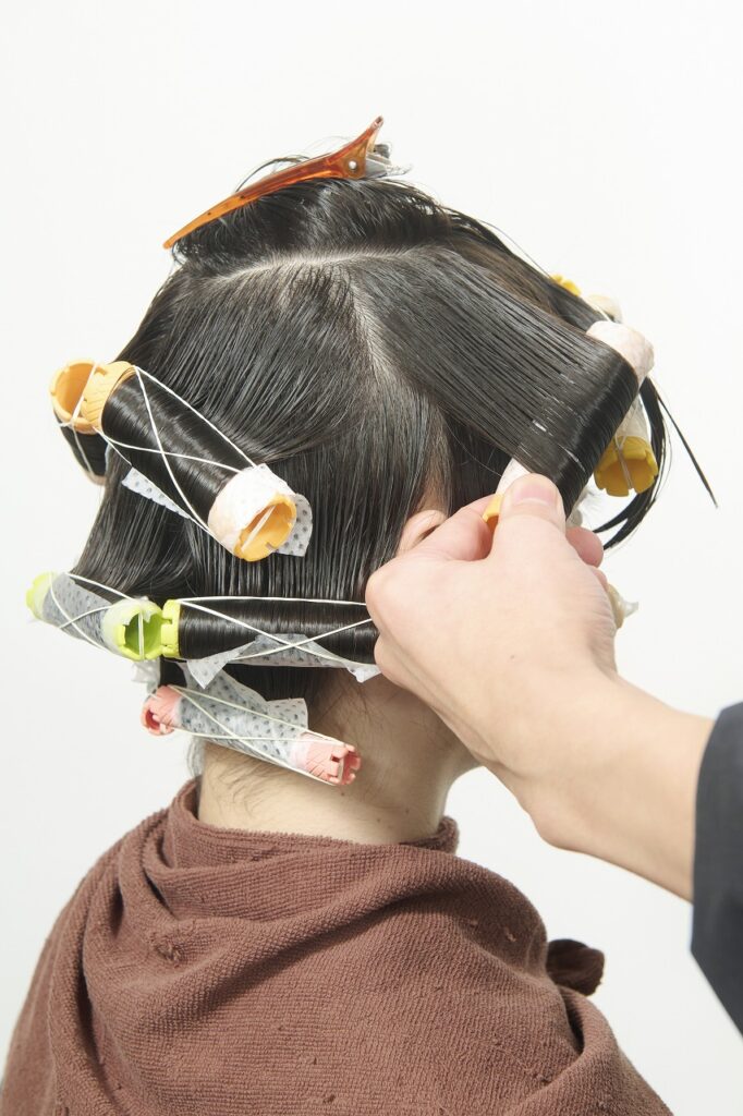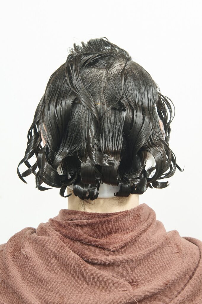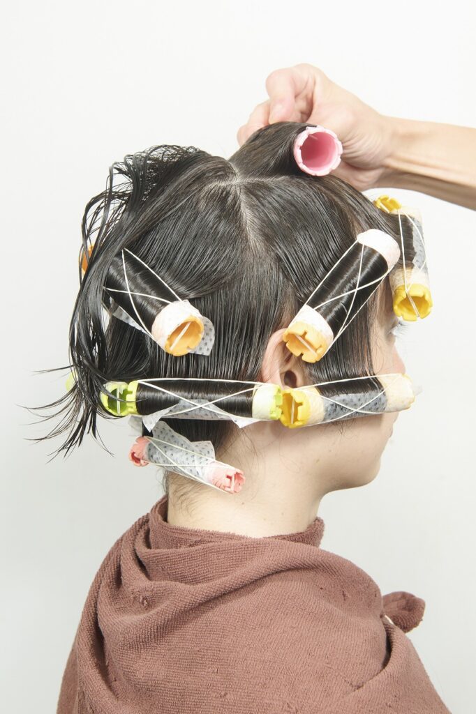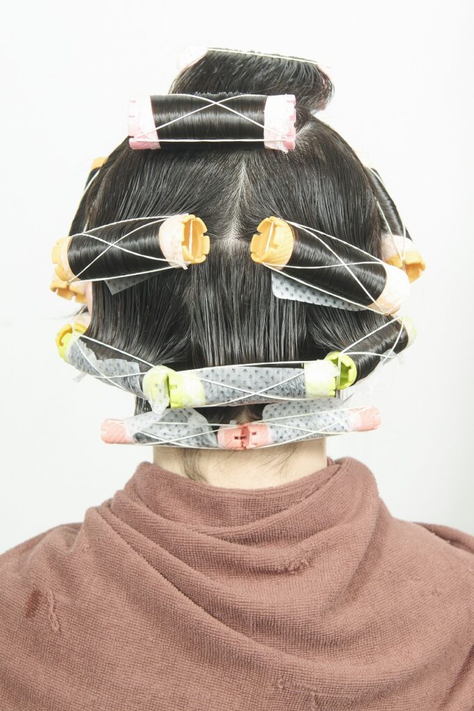 かかりにくいネープとミドルセクションのみ付け巻き。中間から毛先に薬剤を塗布し、平巻き。