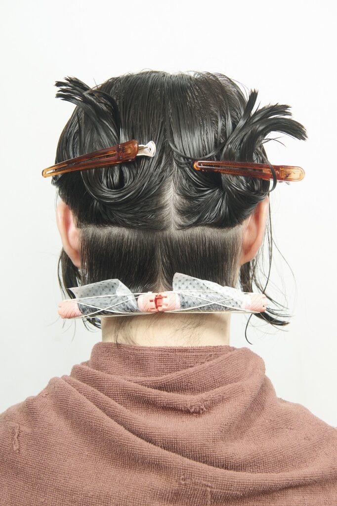 ネープは左右2本。12㎜で毛先から1回転巻く。ハーフカール程度の動きをつける。