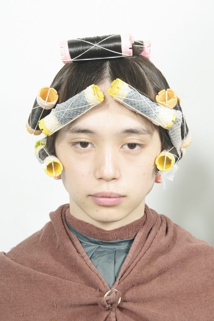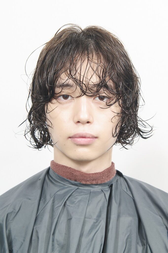 フルドライしてパーマの形状を一度なくす。内側に空気を含ませるようにしながら、ヘアミルクを全体につけて透け感のあるセミマットな質感に仕上げる。これまでグロッシーな仕上がりのヘアが多かった春宮さんの新たな雰囲気を感じる作品に。