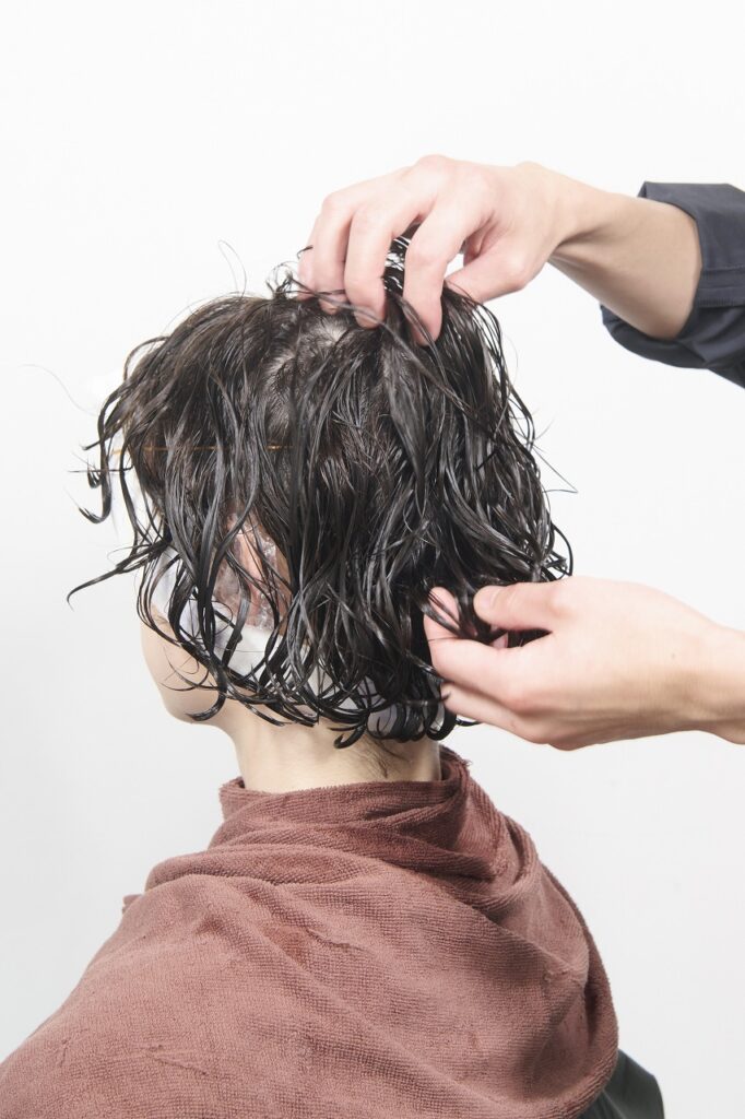 流す前に軽くカールをほぐす。ロッドのままの形状をばらし、仕上がりのイメージに近づいているかをここで確認。お客様にも安心してもらえるポイント。