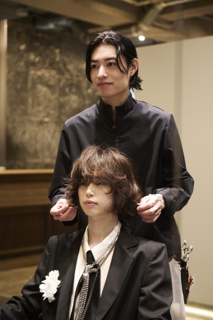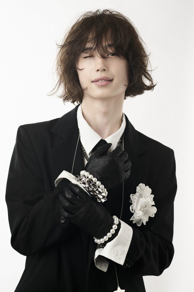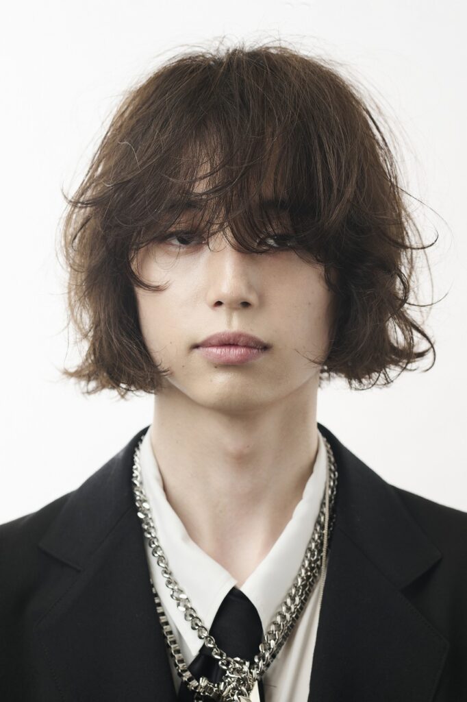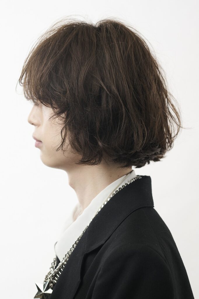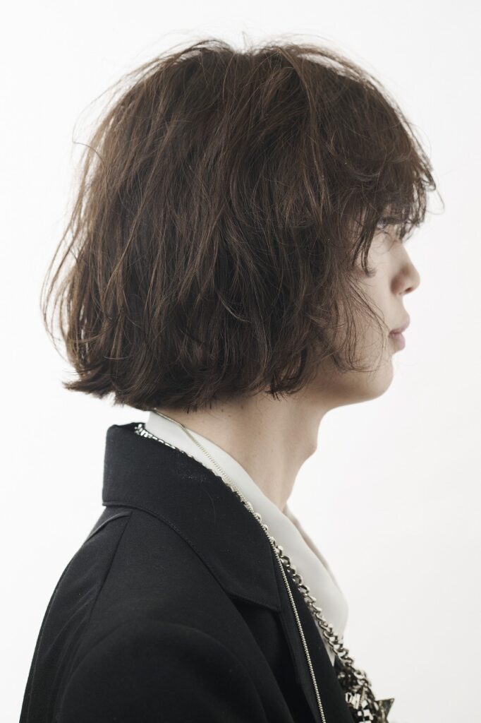 「これまでやっていないバランスを探りたくて、質感はドライに振ってパーマはリバースの動きを加え、自分の中での新しさを求めました。その着地点として設定した全体のテーマは『ラグジュアリーモード』です。上品さと遊びと、そしてずっと心がけているメンズとレディースの垣根を超えたデザイン感とを融合させています」