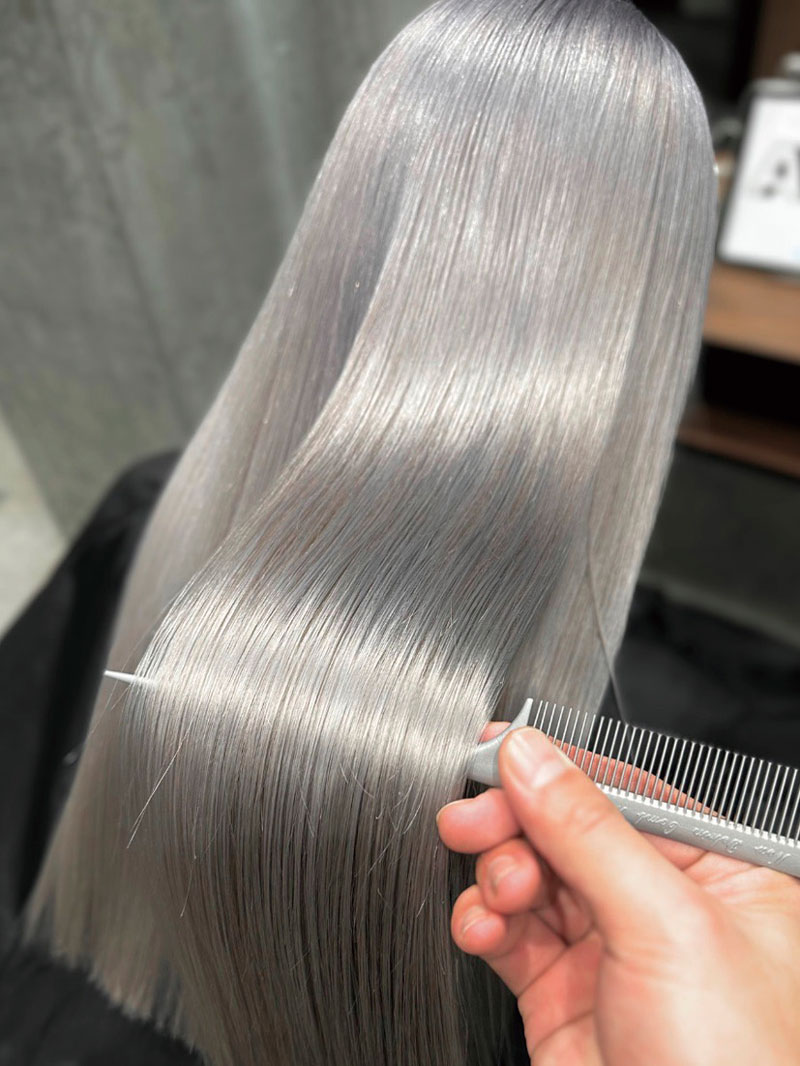どちらの写真もブリーチ3回している髪ですが、高発色でツヤツヤなハイトーンに仕上げました。色落ちまで楽しめるカラーレシピと、ミラートリートメントで作る鏡のような輝きを提供しています。