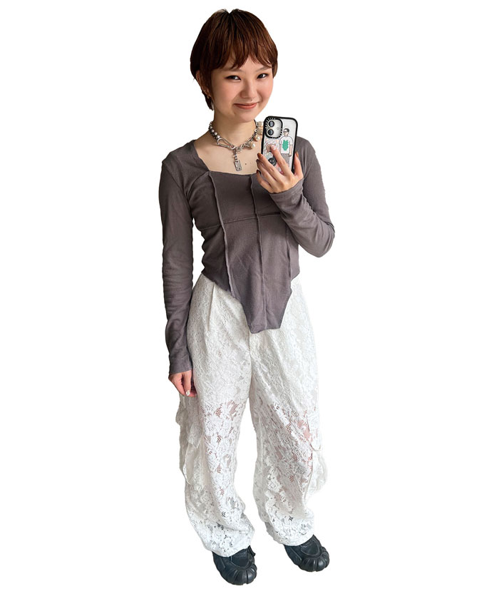 パールとレースパンツがフェミニンなアクセントに