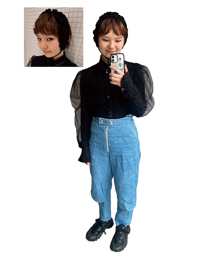 バブーシュカなどの個性的なガーリーアイテムは、黒で落ち着きをプラス。デニムパンツでカジュアルダウンさせるのもコツ。