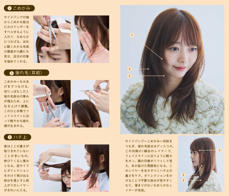 「『COA』の顔まわりのリフトレイヤーが生まれたのは『要らない部分を削り必要な部分を残す』という発想から。具体的には上の3つです。①こめかみをサイドバングからなめらかにつなげる、②後ろれ毛となる耳前に溜まりを残さない、③すそのレイヤー上に重なる毛束(=ハチ上の表面)の重さを取って動きを出すというもの。軽くなりすぎず、ほどよく柔らかい動きが出て、さらに顔の印象も上がって見える。そこから『リフトレイヤー』と名付けました。サロンワークでも頻出のテクニックです」