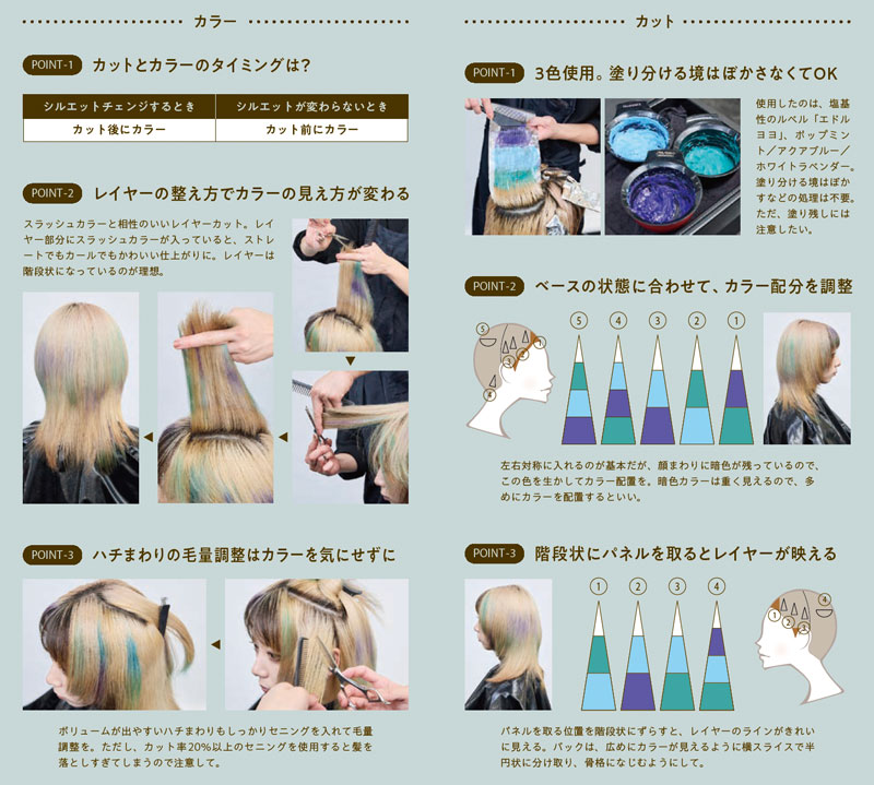 「前回のようにレイヤーが入っていないボブにスラッシュカラーを入れれば、髪に動きがついているように見えますし、レイヤースタイルに入れれば、レイヤーの髪の動きをより際立たせてくれます。レイヤーカットはスラッシュカラーと相性がいいスタイル。階段状のレイヤーのカットラインに、スラッシュカラーを同じく階段状で入れることで、よりレイヤーの動きを目立たせてくれるからです。スラッシュカラーの効果を考え、デザイン提案すれば、お客さまに『いつもと違う』と感じてもらえますよ」