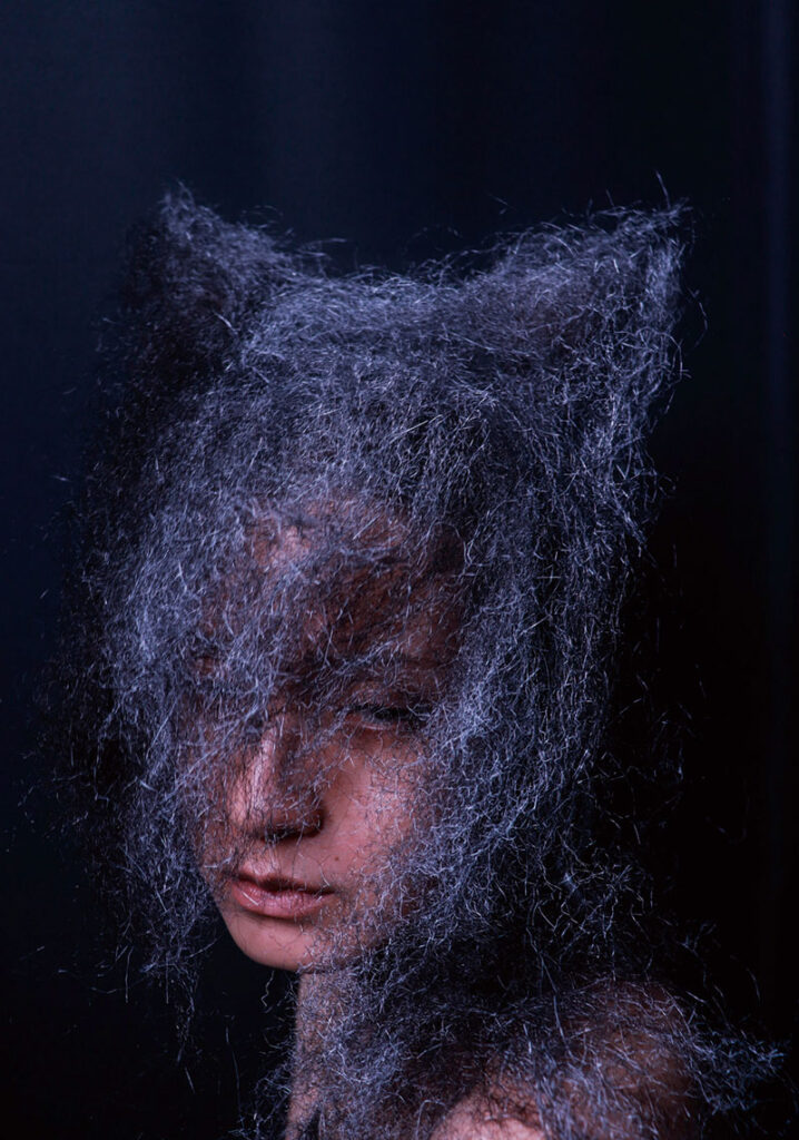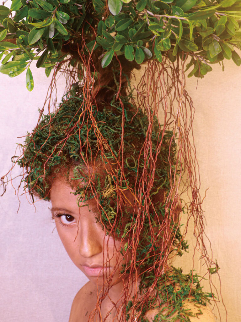 「うまくなりたいという気持ちはありますが、それよりも楽しみたいという気持ちでクリエイションを始めました。『こんなことをやったらおもしろそう』という好奇心をテーマにすることが多いですね。この作品は、沖縄の精霊キジムナーが宿るとされる木“ガジュマル”がテーマ。いちばんのこだわりはリアリティさ。実際にガジュマルから垂れているツルを使い、髪の毛を編み込み、木の幹を表現。木の生命力の強さをモデルの目力で表現したのもポイントです」